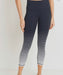 These gorgeous and dramatic Capri-length leggings feature a special and exclusive yarn-dyed pattern in black with white-melange stripes in graduated width. 87% polyester, 13% spandex. Tummy control. Moisture-wicking. Four-way stretch.